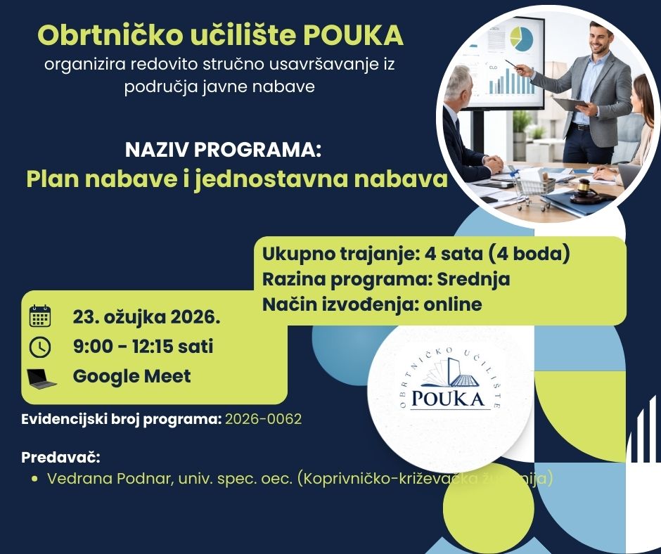 U sklopu redovitog stručnog usavršavanja u području javne nabave, Obrtničko učilište POUKA organizira webinar namijenjen stručnoj i široj javnosti.